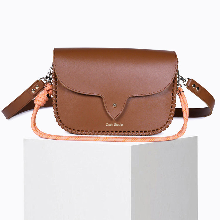 Le sac Wish Tan reprend les codes iconiques de la ligne West dans une version plus spacieuse, idéale pour un usage quotidien. Réalisé en cuir de veau rigide camel, il associe lignes structurées, coutures en cuir faites à la main et esprit western revisité avec modernité.