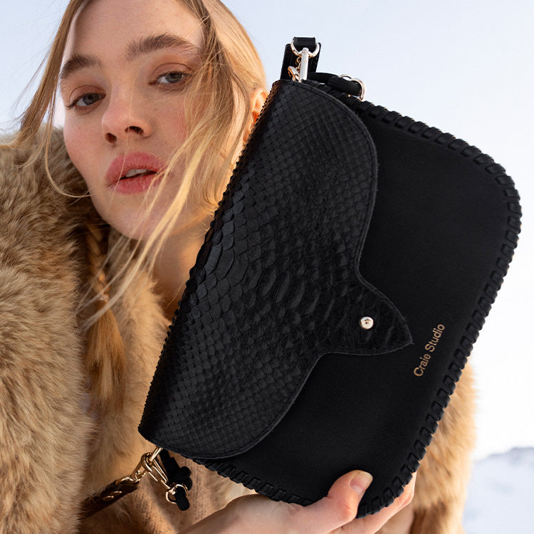 Le West Python Noir, et sa version grand format Wish, revisitent notre modèle iconique dans une version luxueuse. Ils associent un corps en cuir de veau rigide noir à un rabat en cuir python véritable noir, pour une élégance assumée et un contraste raffiné.
