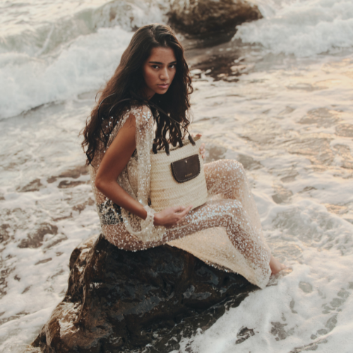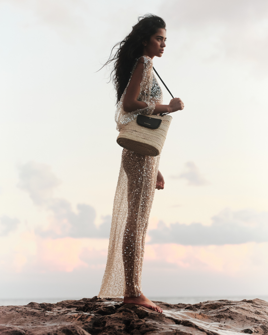 La palette gagne en éclat : ors lumineux, noirs profonds, nuances chaudes traversées de reflets. Paille tressée, cuirs dorés, textures subtilement scintillantes captent chaque variation du soleil.