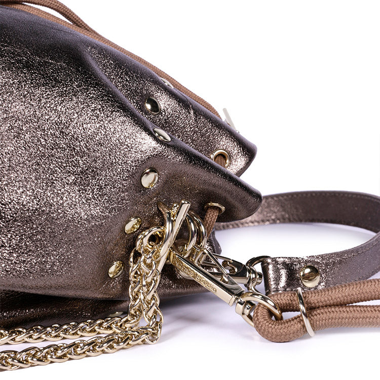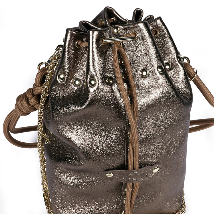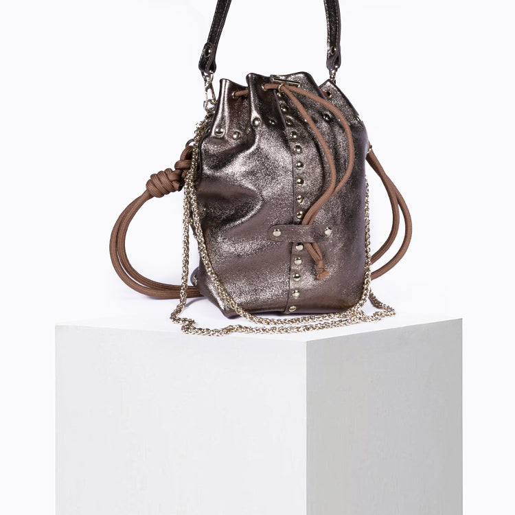 Le Beco Lunar revisite le format seau iconique du Bibi dans une version en cuir métalllisé souple.