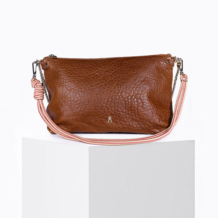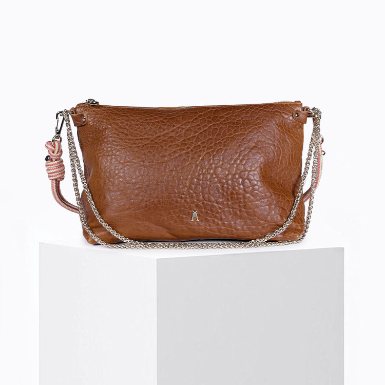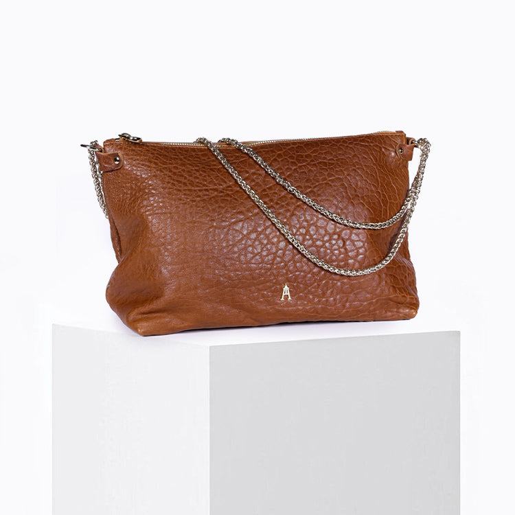 Le Mallow Bubble Havana est notre sac souple au volume idéal, ici décliné en cuir camel, au grain naturellement bullé : chaque sac est unique.