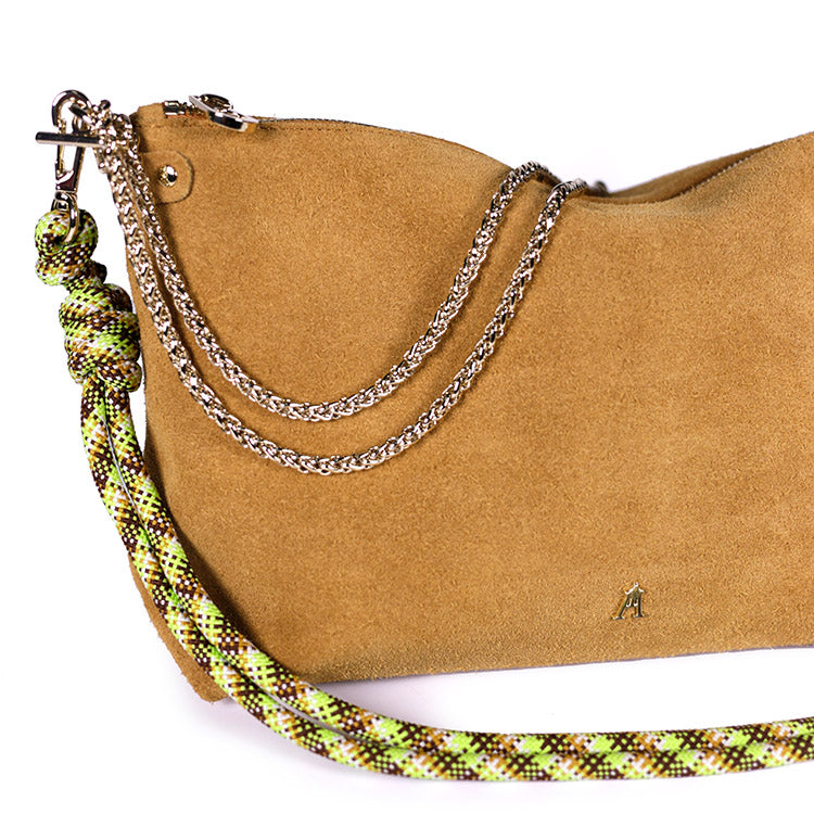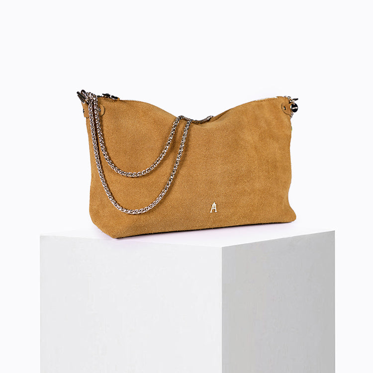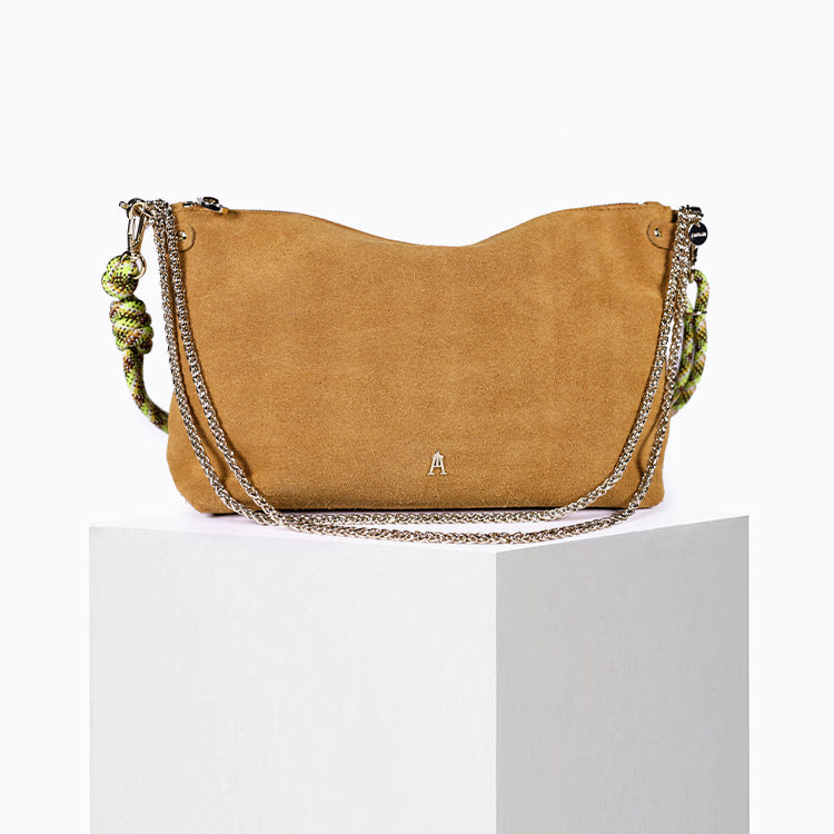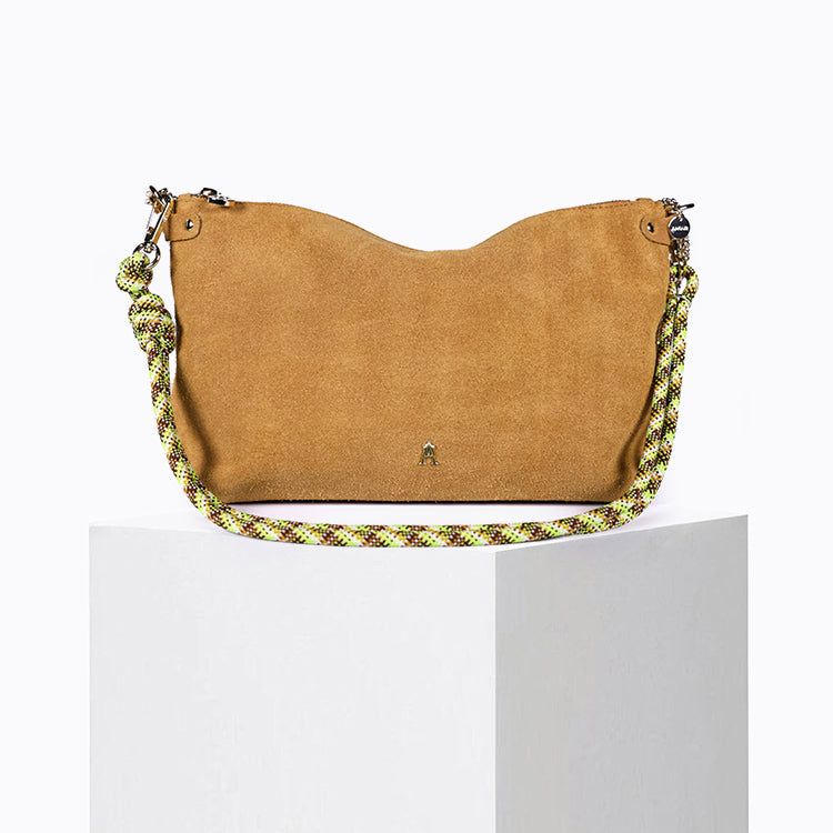 Le Mallow est notre sac souple et bohème par excellence, ici décliné dans la matière star de la saison un daim Havane : un coloris came clair, au toucher doux.
