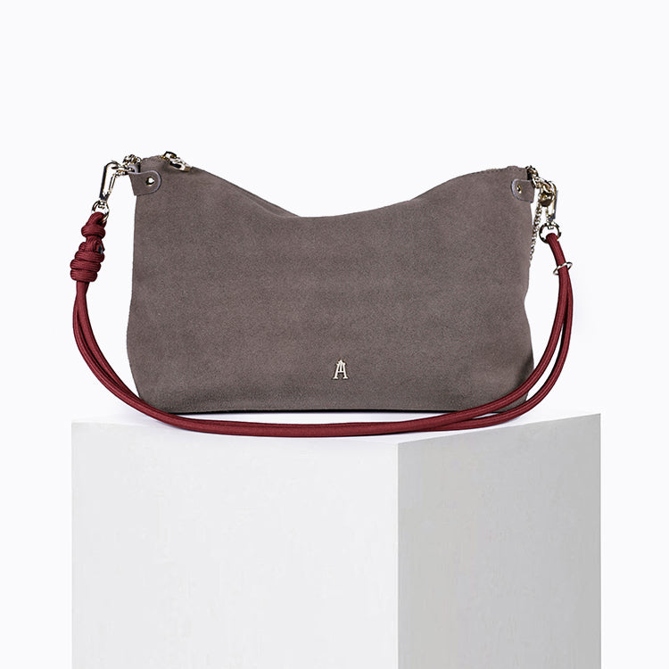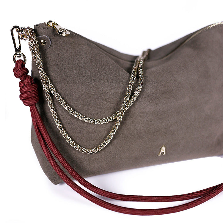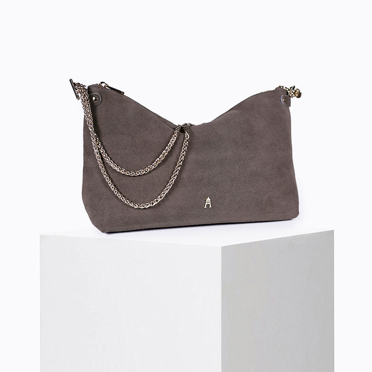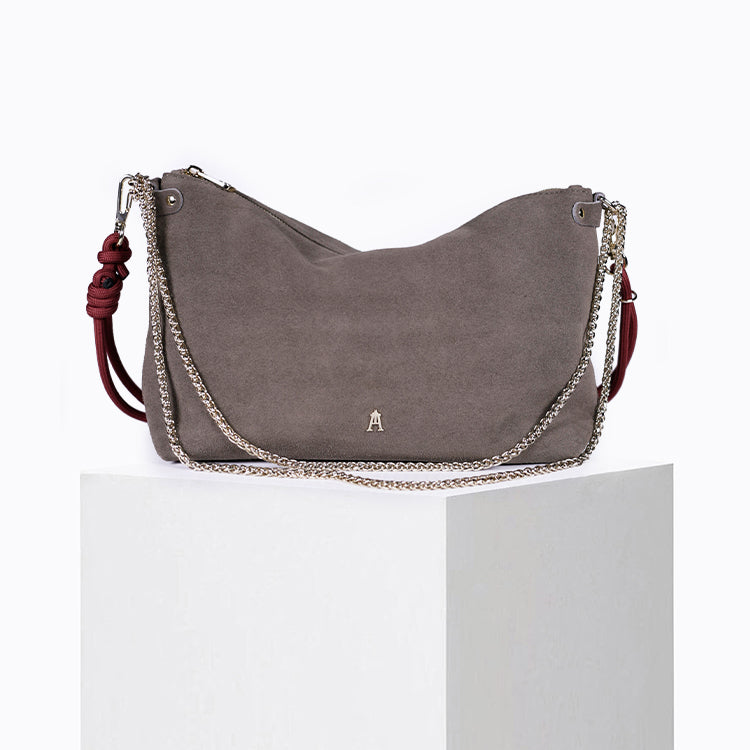 Le Mallow est notre sac souple et bohème par excellence, ici décliné dans la matière star de la saison un joli daim Taupe, au toucher doux.