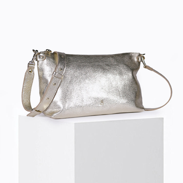 Un sac en cuir métallisé qui allie confort, modularité et élégance.