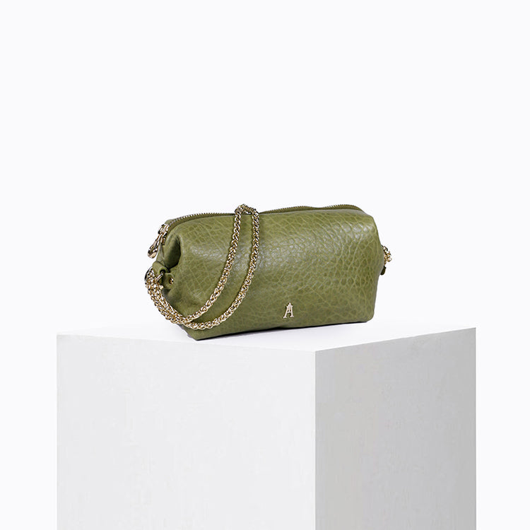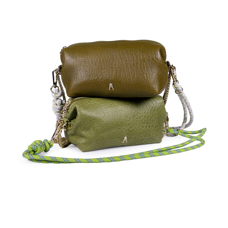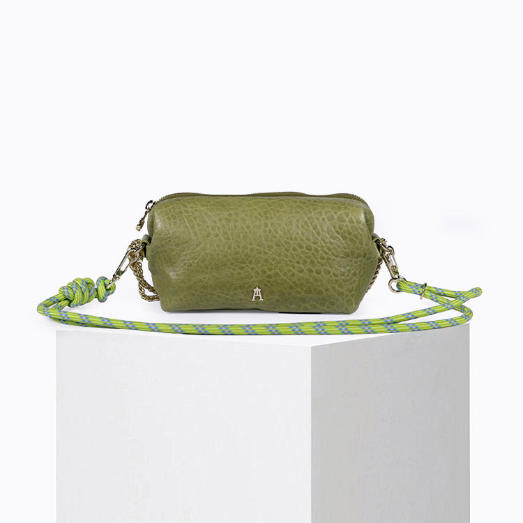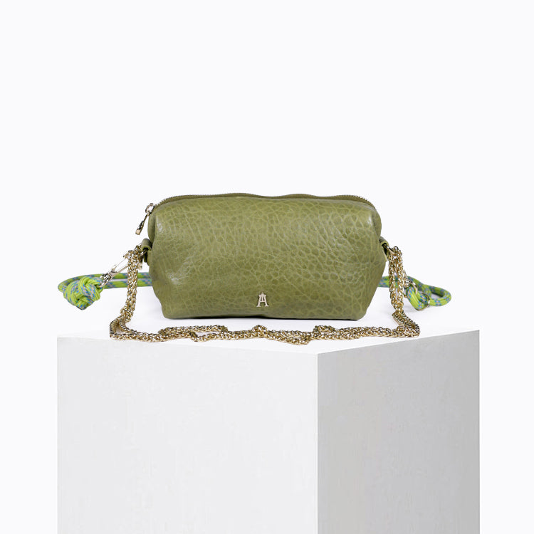 La Pochette Nuage Bubble Amande est un mini sac en cuir modulable, pensé pour accompagner le quotidien avec style et légèreté. Réalisée en cuir d’agneau bubble coloris vert amande, naturellement bullé, chaque pièce est unique et révèle une texture souple au caractère authentique.