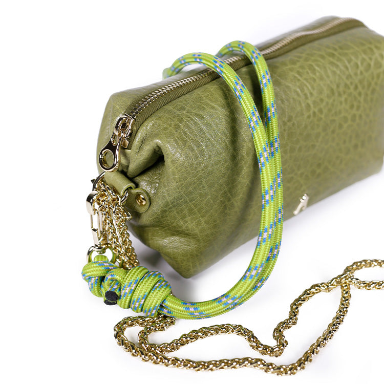 Polyvalente, la Nuage Bubble Amande est livrée avec deux bandoulières amovibles et réglables : une chaîne escargot dorée claire, élégante et modulable (elle peut se doubler pour un porté plus court), et une corde d’escalade Tech Pistache pour une touche plus graphique et contemporaine.