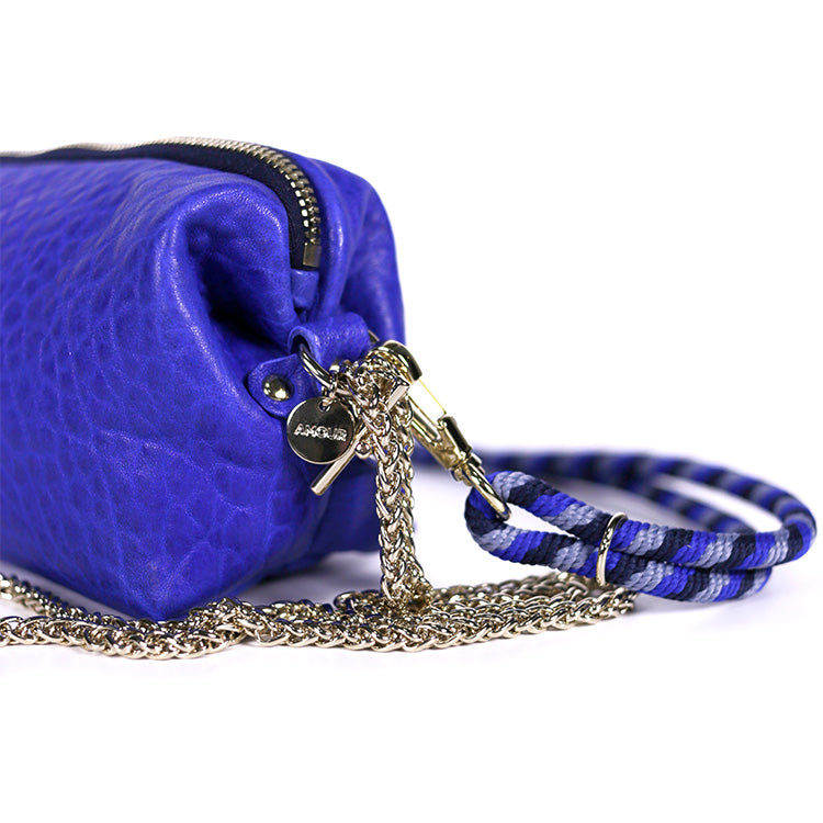 Son petit plus, il est livré avec deux bandoulières : une sophistiquée en chaîne escargot doré clair (qui peut se doubler pour la raccourcir), l'autre plus mode, en corde d'escalade torsade bleu.