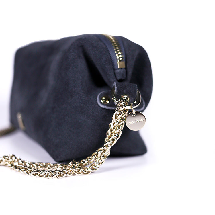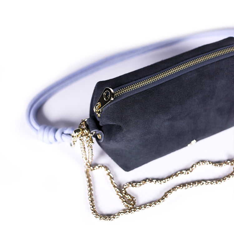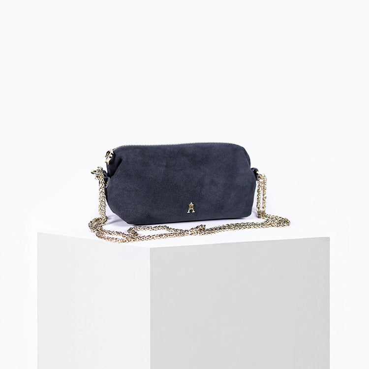 Confectionnée en daim bleu marine froid, matière phare de la saison, cette pochette offre un look à la fois sobre et audacieux. Sa texture douce, doublée de coton bio, en fait un accessoire confortable et pratique pour le quotidien.