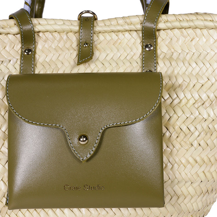 À la fois élégant et pratique, ce panier est doté d’une poche extérieure en cuir de veau kaki, soulignée de surpiqûres contrastées bleues, idéale pour garder vos essentiels à portée de main. Son format généreux en fait le compagnon parfait des journées ensoleillées, aussi bien en ville qu’à la plage.