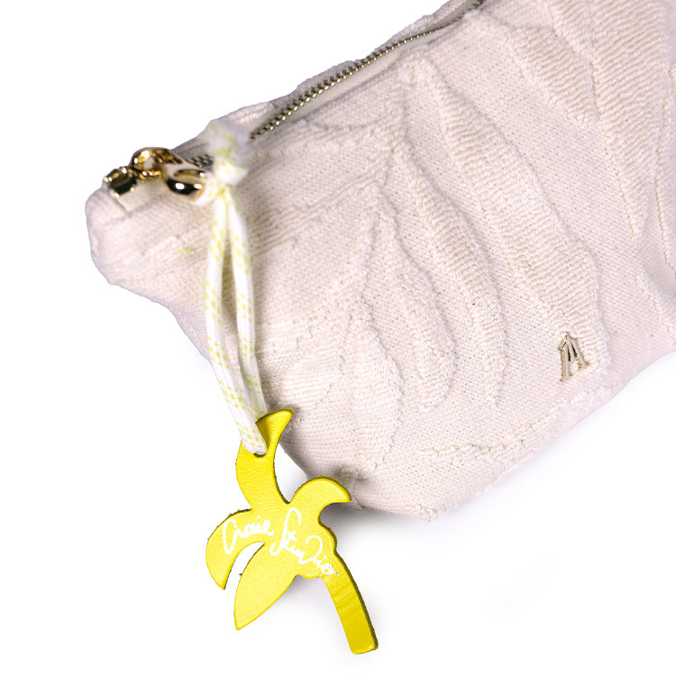 La trousse Sable Feuille coloris écru est une pochette issue de notre collection Craie Beach Club, développée dans un tissu éponge 100 % coton bouclette.