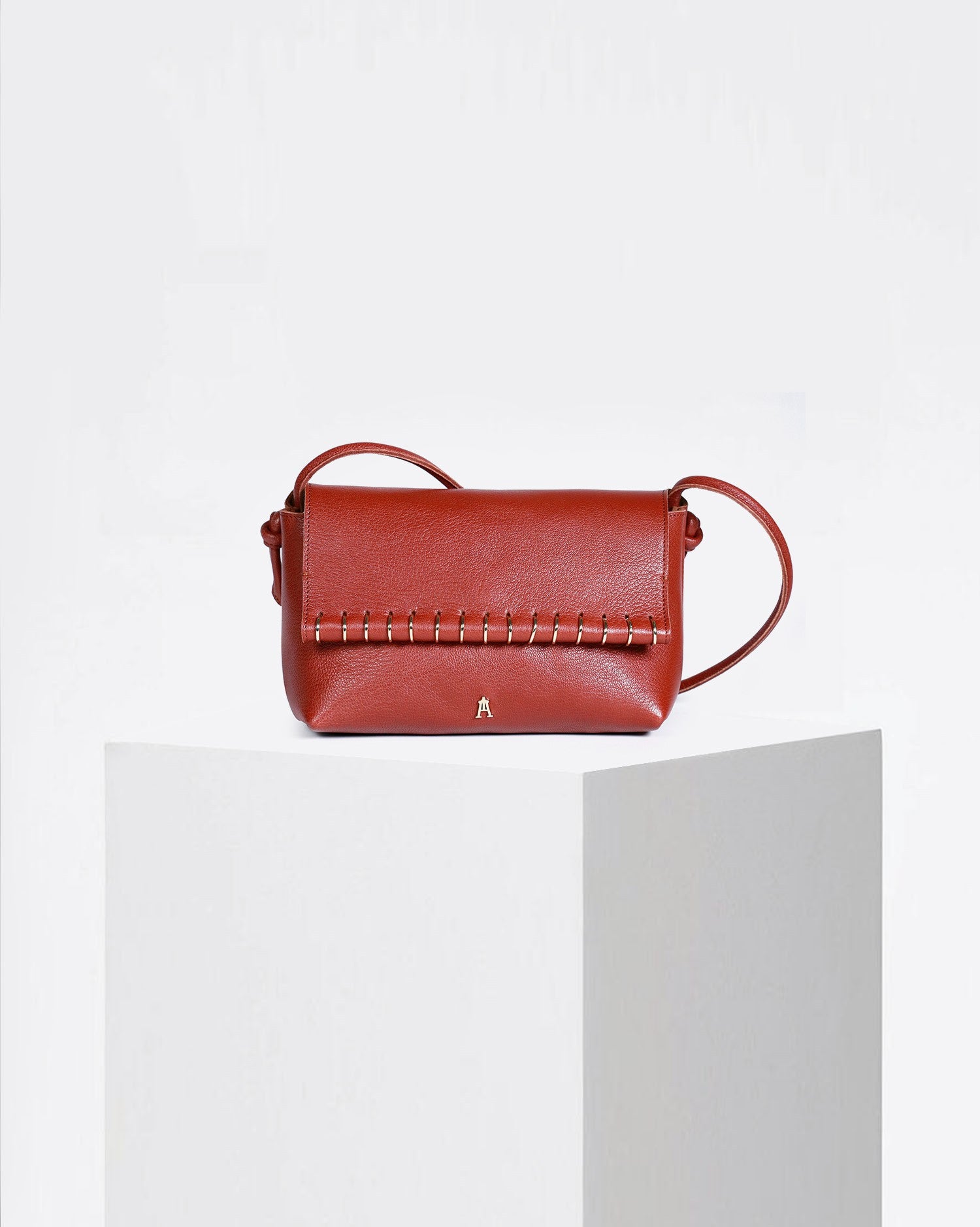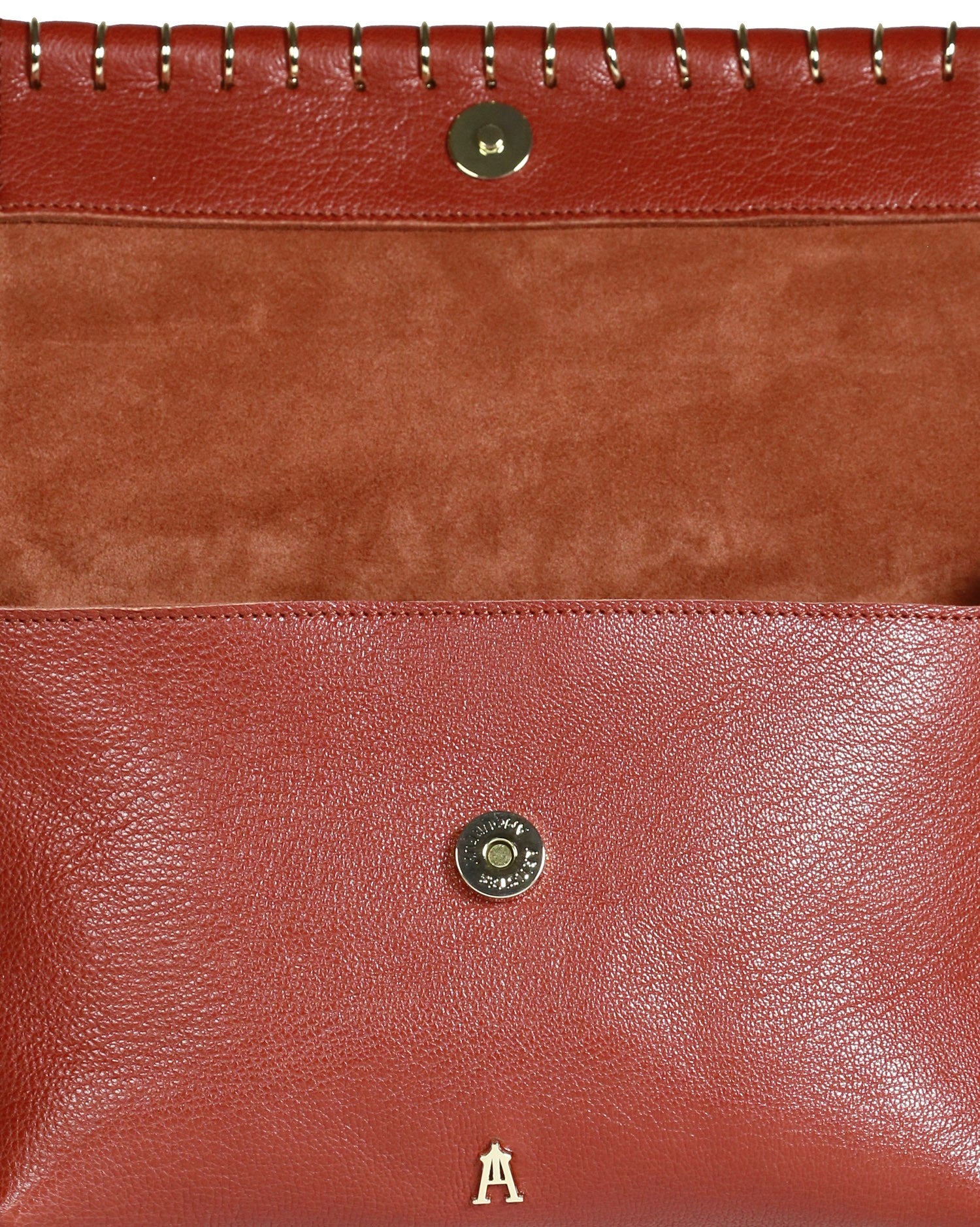 Le Amie est un nouveau petit sac en cuir de chèvre grainé caramel, entièrement doublé de cuir daim.