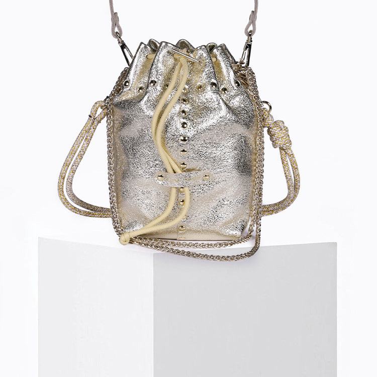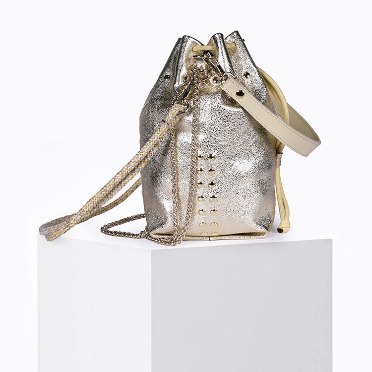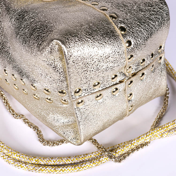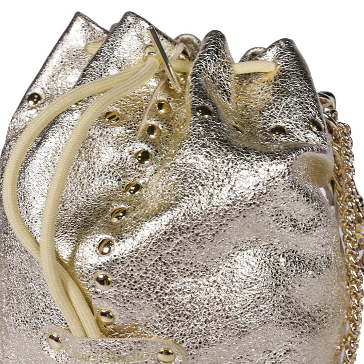 Le Beco Stud Or revisite le format seau iconique du Bibi dans une version précieuse et affirmée, réalisée en cuir d’agneau métallisé or clair champagne.