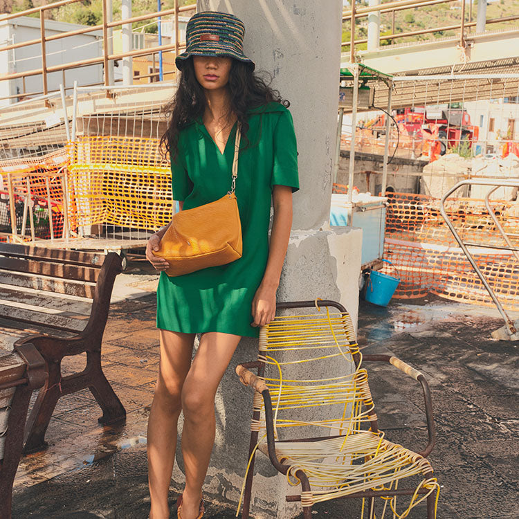 Il est réalisé en cuir d'agneau bubble jaune naturellement bullé, chaque sac est unique. Sa texture souple, doublée de coton bio, en fait un accessoire beau et pratique pour le quotidien. Avec son format généreux et sa grande souplesse, il se porte selon vos envies : à l’épaule, à la main ou en pochette oversize. Idéal du matin au soir, il mêle confort et allure.