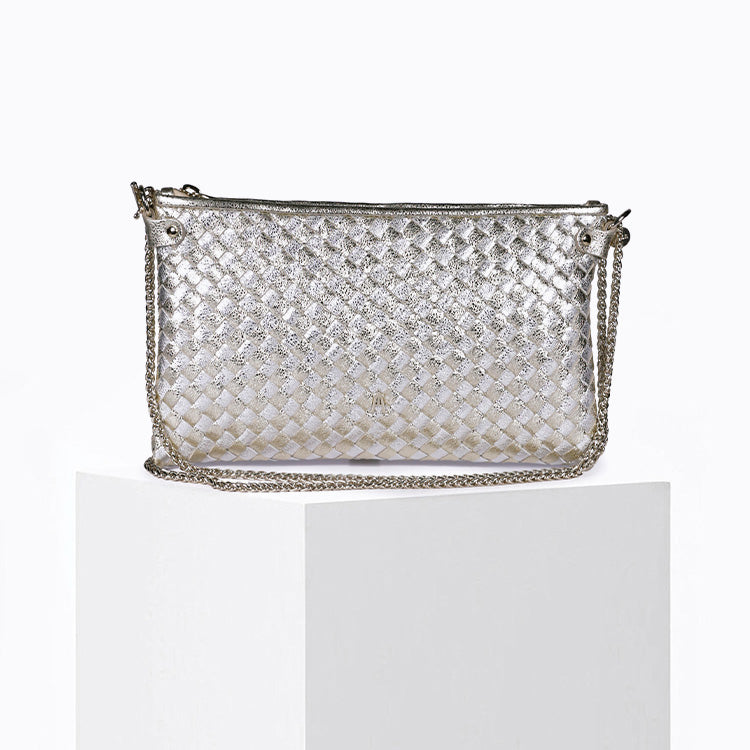Le Pillow Argent Or est une pochette plate en cuir tressé, au style précieux et contemporain. Réalisée en cuir d’agneau, elle est entièrement travaillée selon la technique traditionnelle de l’intrecciato, mêlant des nuances argent et or pour un rendu lumineux et sophistiqué.