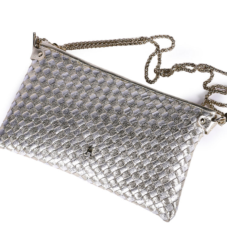 Fine, souple et élégante, cette pochette séduit par son tressage manuel, qui apporte relief, texture et caractère tout en conservant une silhouette épurée. Son format plat en fait un accessoire idéal aussi bien en journée qu’en soirée.