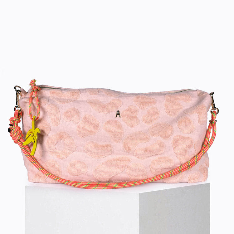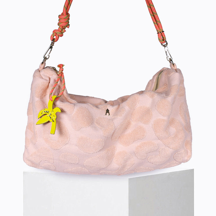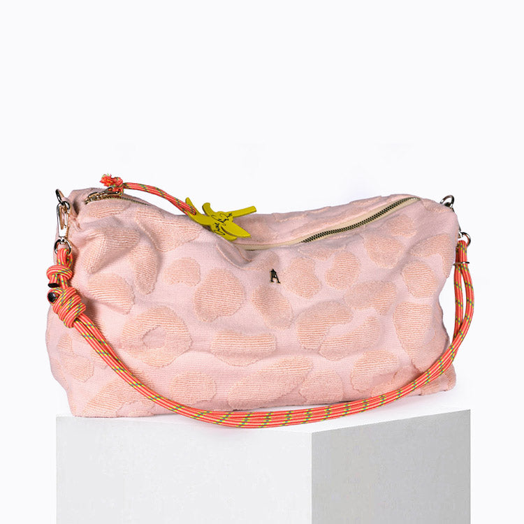 Le Milady Pêche est un sac hybride en tissu éponge bouclette 100 % coton coloris rose pêche, pensé comme une maxi pochette souple qui se porte en bandoulière, à la manière d’une banane chic.