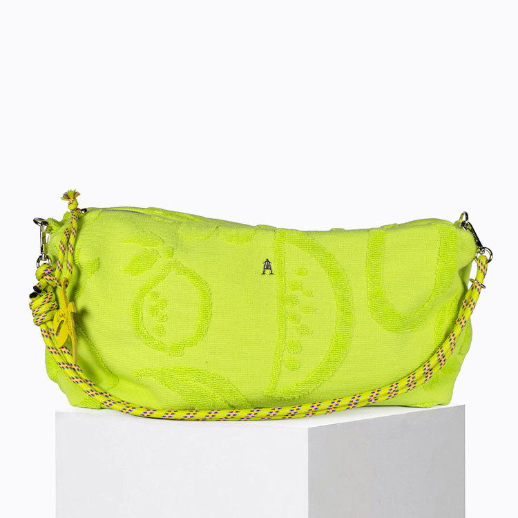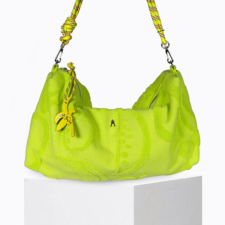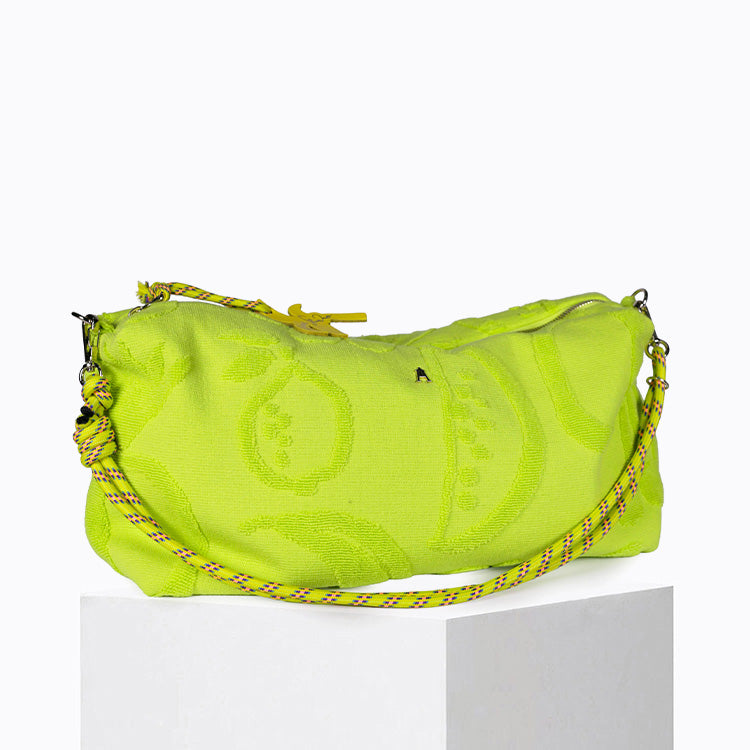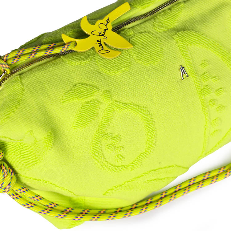 Le Milady Zest est un sac hybride en tissu éponge bouclette 100 % coton coloris vert fluo, pensé comme une maxi pochette souple qui se porte en bandoulière, à la manière d’une banane chic.
